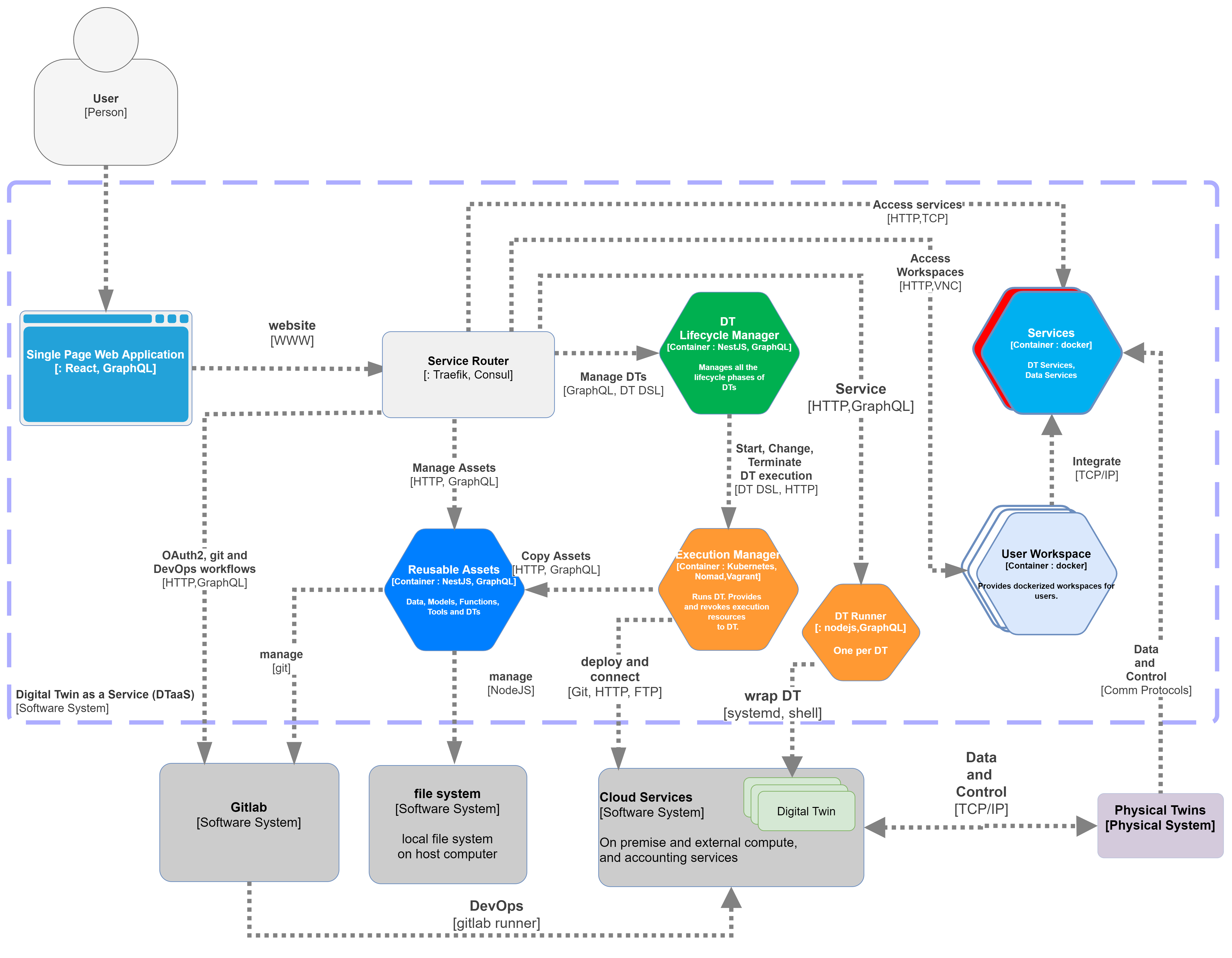 - DT Execution Manager provides virtual and isolated execution environments for DTs. The execution manager is also responsible for dynamic resource provisioning of cloud resources.